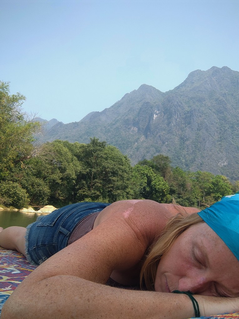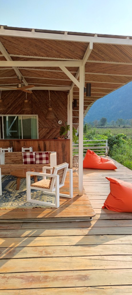 A quelques kilomètres de Vang Vieng, dans le village de Pakpo, c’est au coeur d’un cadre idyllique que je découvre mon écolodge.