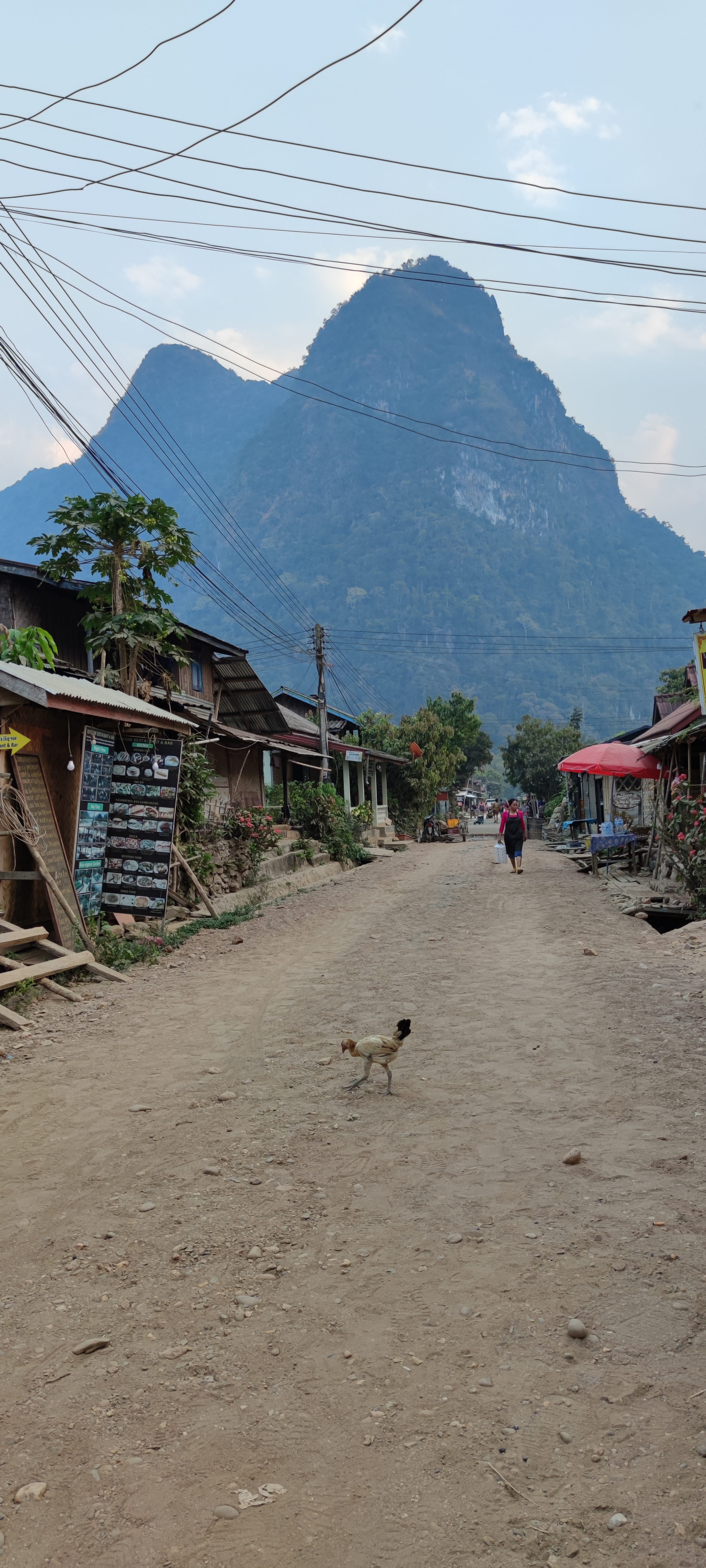 Je rejoins Muang Ngoy, à une heure de bateau. Ce petit village entouré d’impressionnantes formations karstiques m’enchante immédiatement. Une seule rue qui, en 4 jours, passera du chemin de terre à la route bétonnée pour le plus grand bonheur des locaux – un peu moins me concernant : drôle de timing!