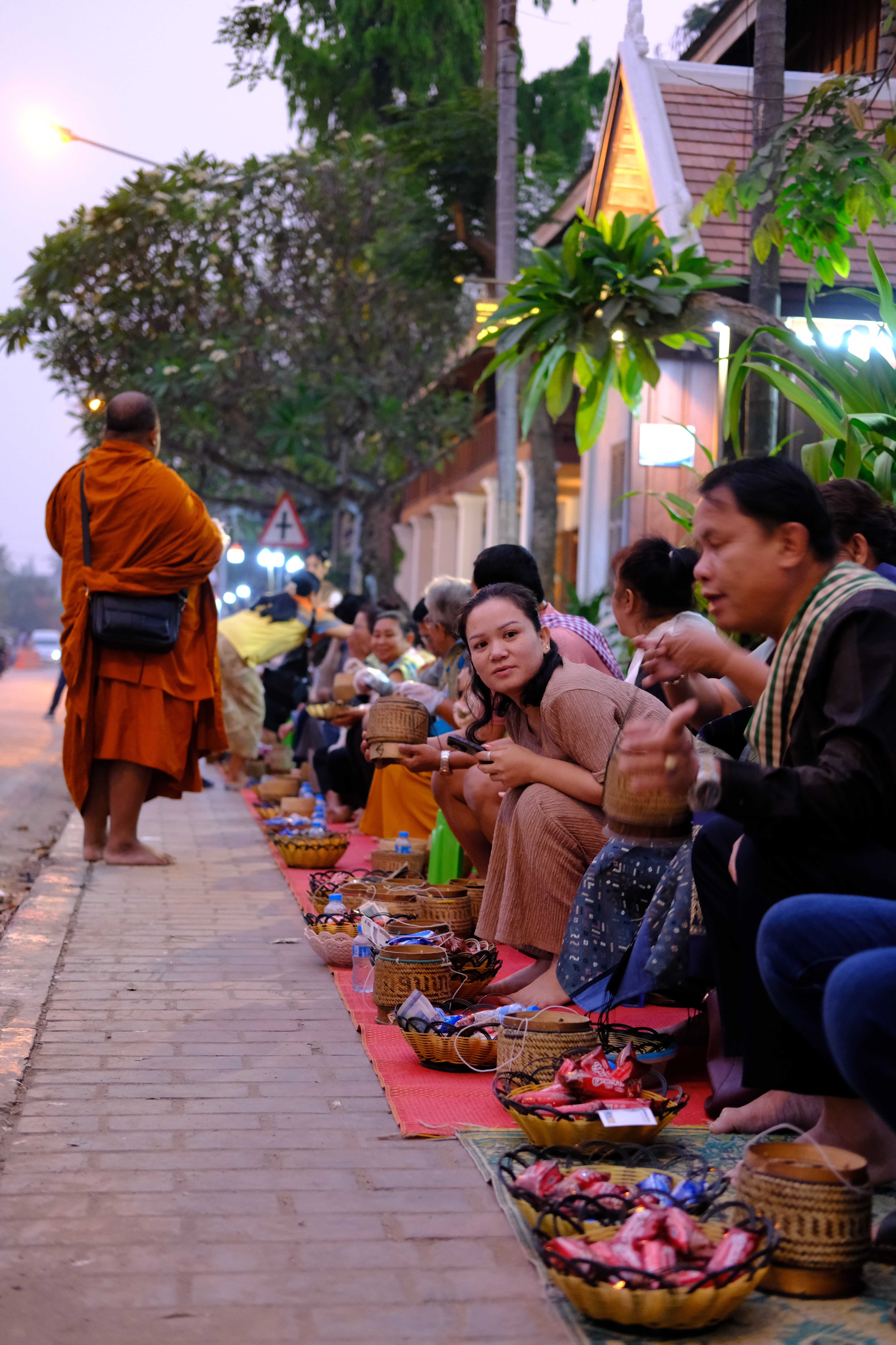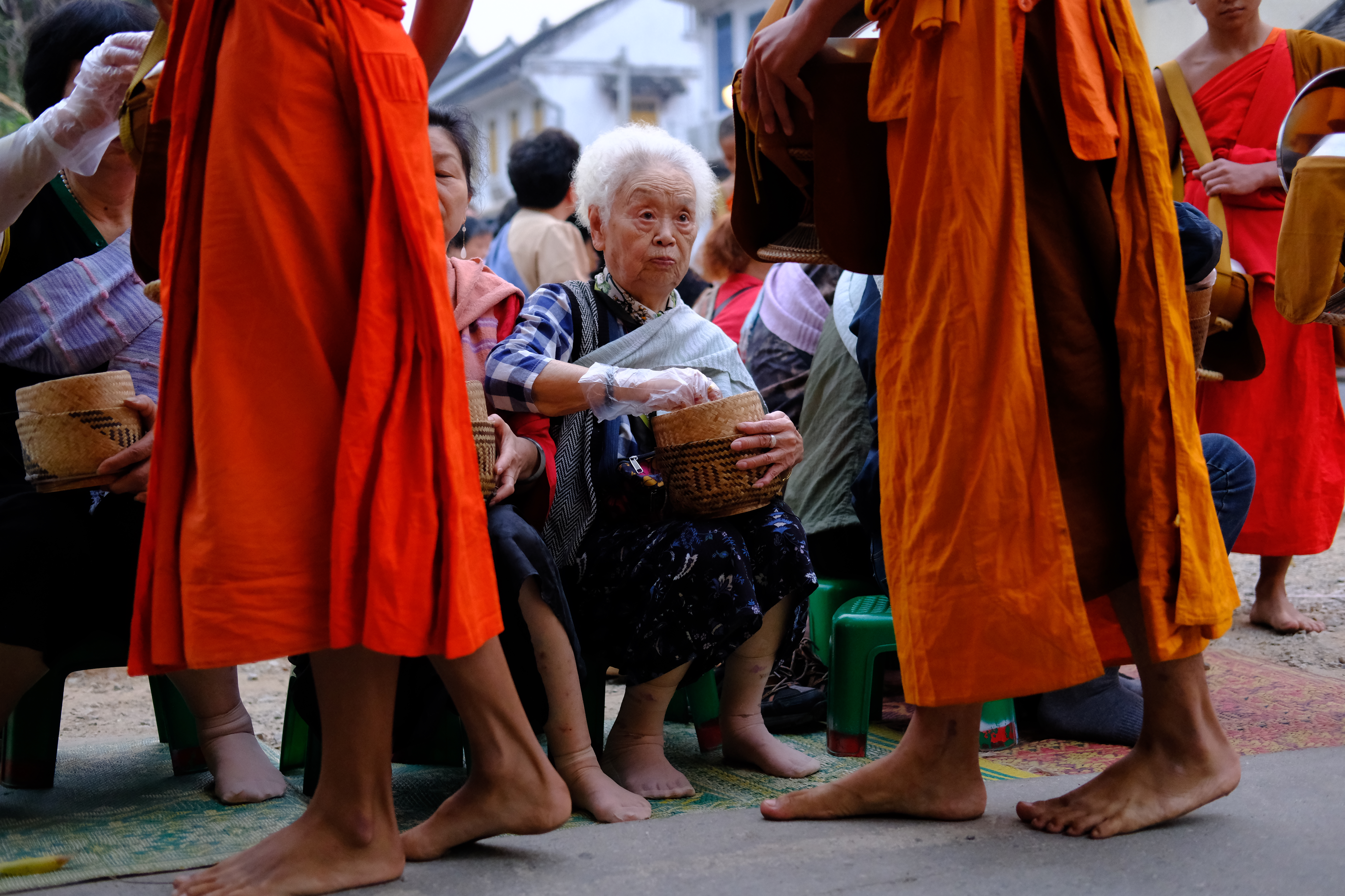 Les habitants, assis sur des petits tabourets afin de ne pas être à leur hauteur, donnent à chaque moine un peu de nourriture – en retour ces derniers les bénissent et offrent eux même un peu de ce qu’ils ont reçu aux plus pauvres.