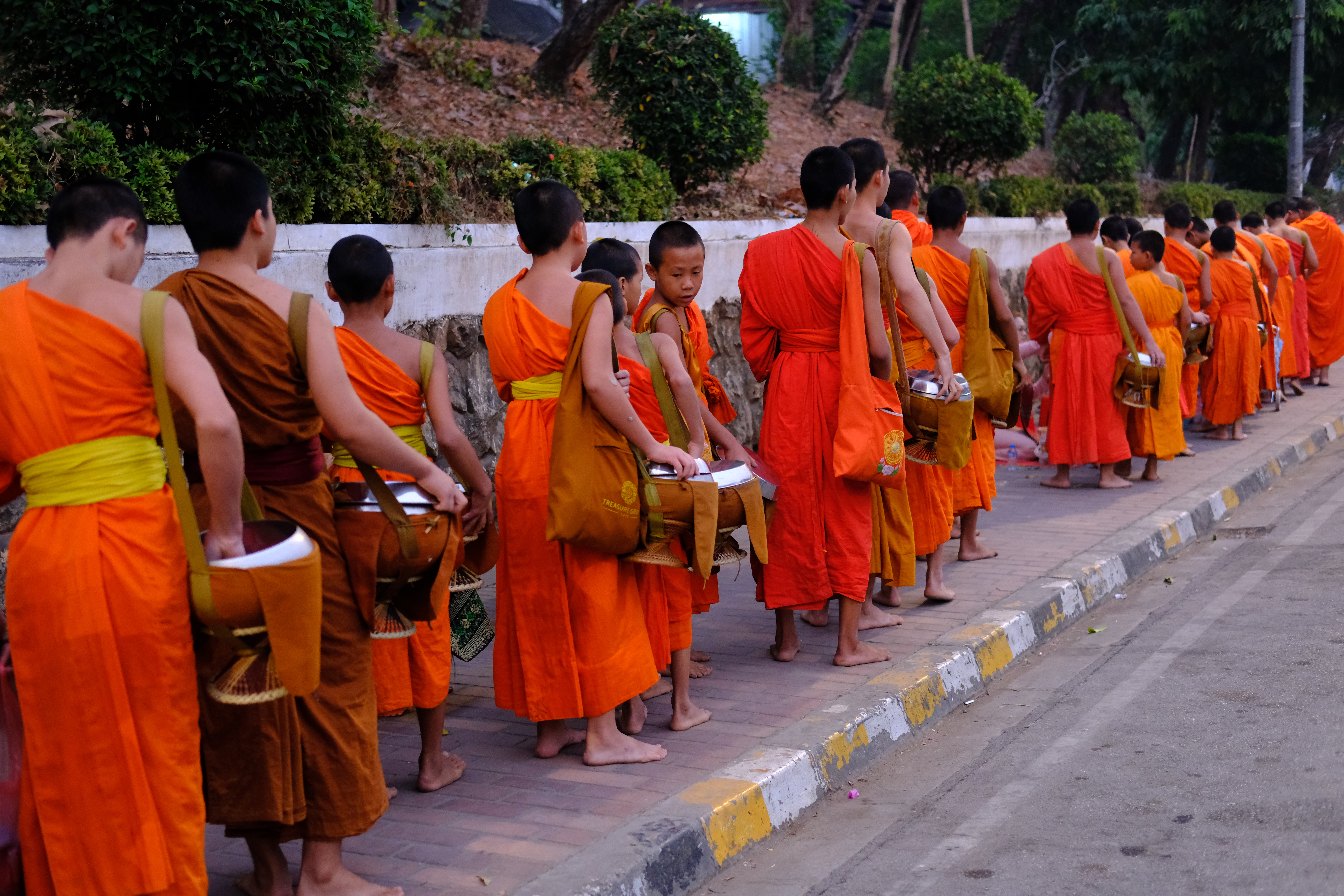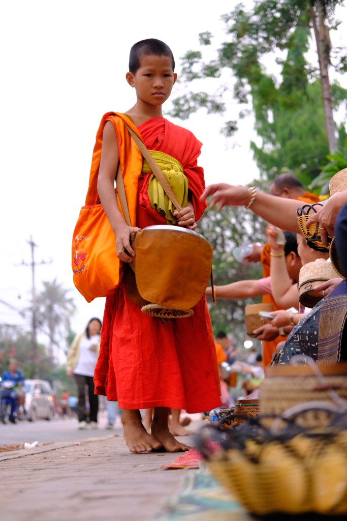 Pieds nus, vêtus de leur robe safran, les moines défilent et s’approvisionnent en riz gluant, fruits et biscuits. Cette nourriture sera leur seul repas de la journée.